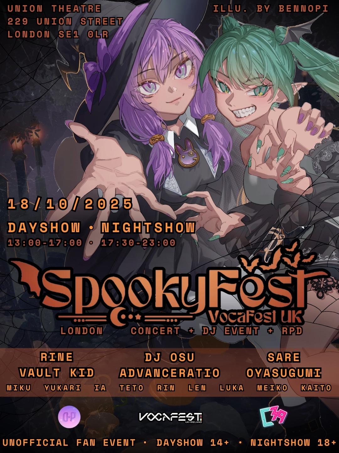 Join us back at the Union Theatre. This time for a halloween themed Vocaloid Event. With afternoon and evening showings available for a wider range of ages. Each showing features a full Vocafest concert and other activities in the two studios. We will also be bringing the Vocafest stall with a wide range of Vocaloid goods.